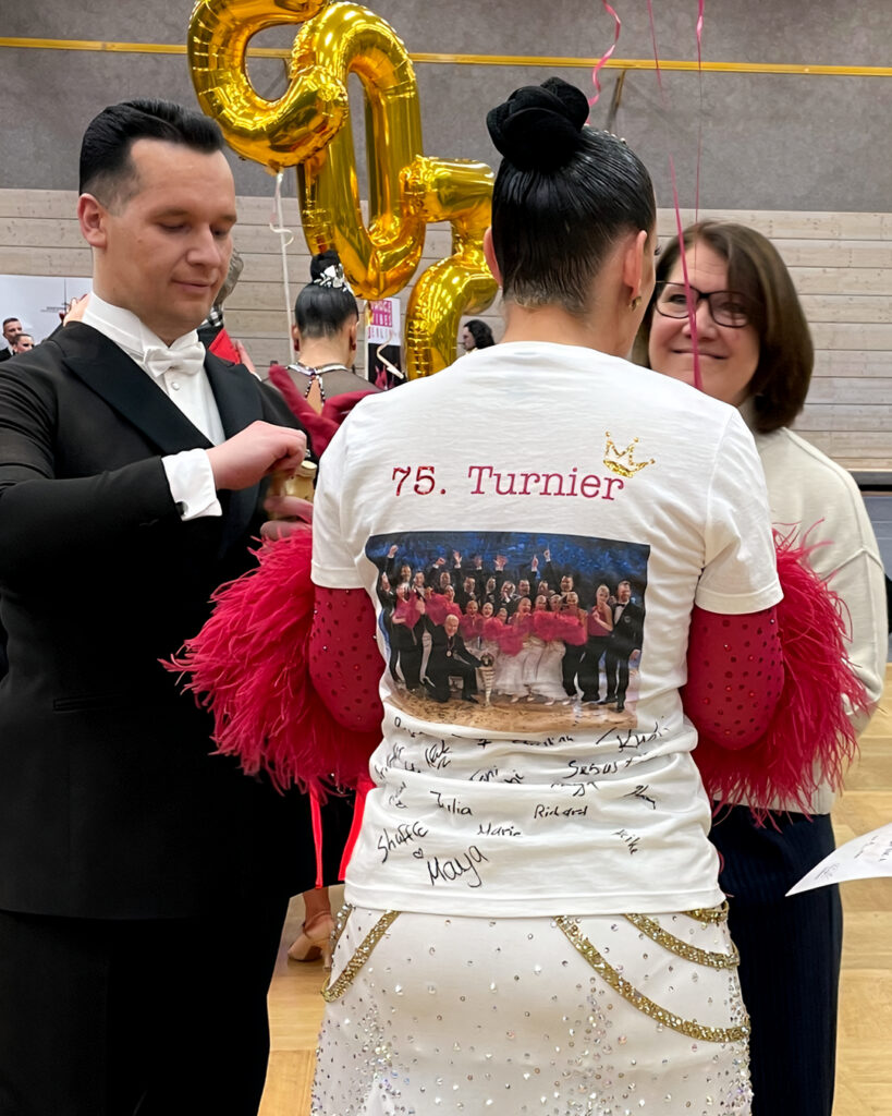 ‚Fine‘ tanzte an diesem Tag ihr 75. Formationsturnier und erhielt dafür von der Mannschaft zur Erinnerung u.a. ein bedrucktes und unterschriebenes T-Shirt.