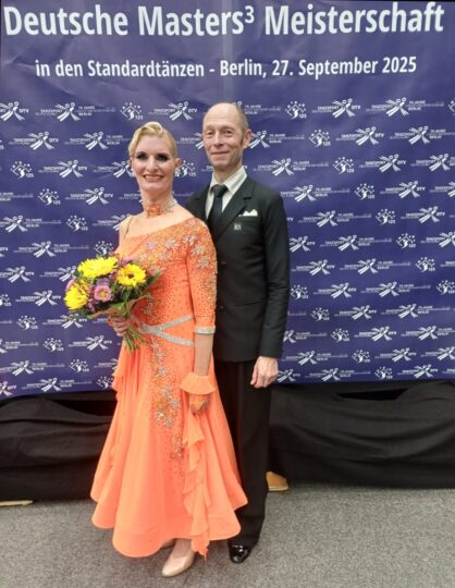 Es war ihr zweites Turnier nach dreijähriger Verletzungspause – und was für eins! Miriam und Peter Pfeiffer starten nach ihrem tollen Ergebnis vor zwei Wochen bei den Landesmeisterschaften in Hamburg nun bei der Deutschen Meisterschaft Master III S Standard in Berlin. Dabei überzeugten sie von Beginn an und fanden problemlos zur gewohnten tänzerischen Qualität zurück.