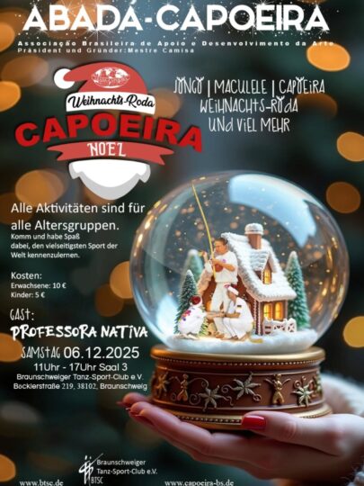 Am 06.12.2025 lädt der Verein Abadá-Capoeira von 11:00-17:00 Uhr zu einem besonderen Event in den Braunschweiger TSC ein. In einer großen Weihnachts-Roda können Besucher unter dem Motto Integration und Geselligkeit nicht nur die Aktivitäten der Capoeiristas und ihren Sport kennenlernen, auch das Rahmenprogramm kann sich sehen lassen.