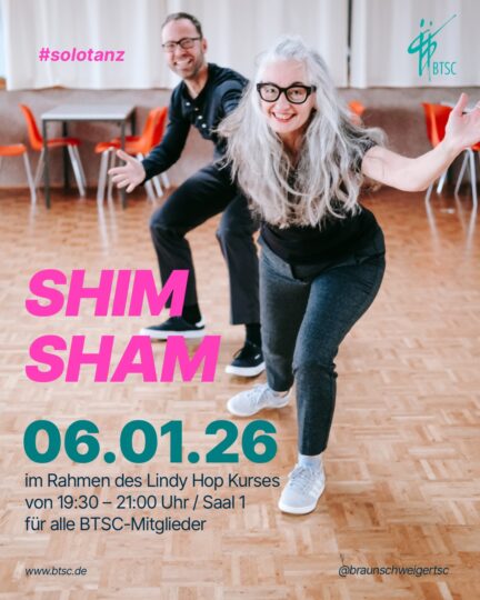Der Shim Sham ist eine einfache, ikonische Step-Routine aus der Jazz- und Swingtradition. Ursprünglich von Stepptänzern entwickelt, hat er sich weltweit als Tanz etabliert, der in der Lindy Hop Community auf keiner Party fehlen darf. Am 6. Januar 2026 möchten wir die Grundschritte und ihre typische Abfolge BTSC-Mitgliedern kostenlos vermitteln.