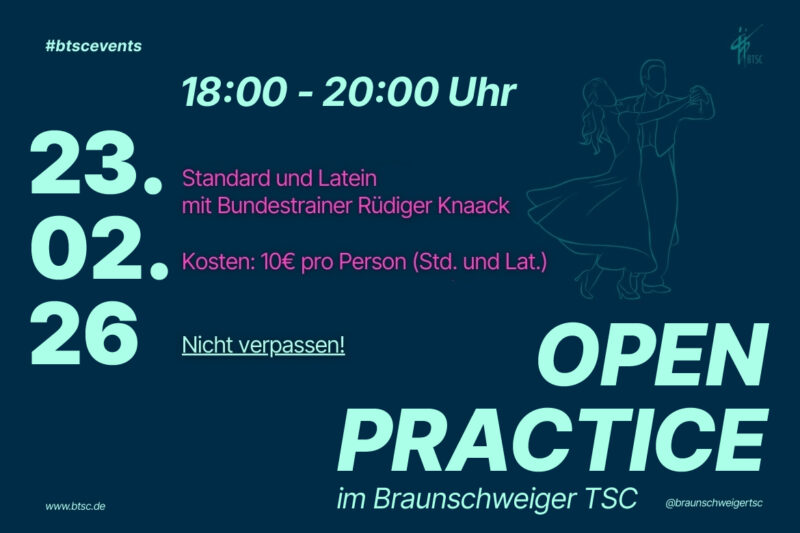 Am 23.02.2026, 18:00 bis 20:00 Uhr, bietet Bundestrainer Rüdiger Knaack im Tanzsportzentrum des Braunschweiger TSC (Böcklerstr. 219, 38102 Braunschweig) wieder eine Open Practice Standard und Latein an.