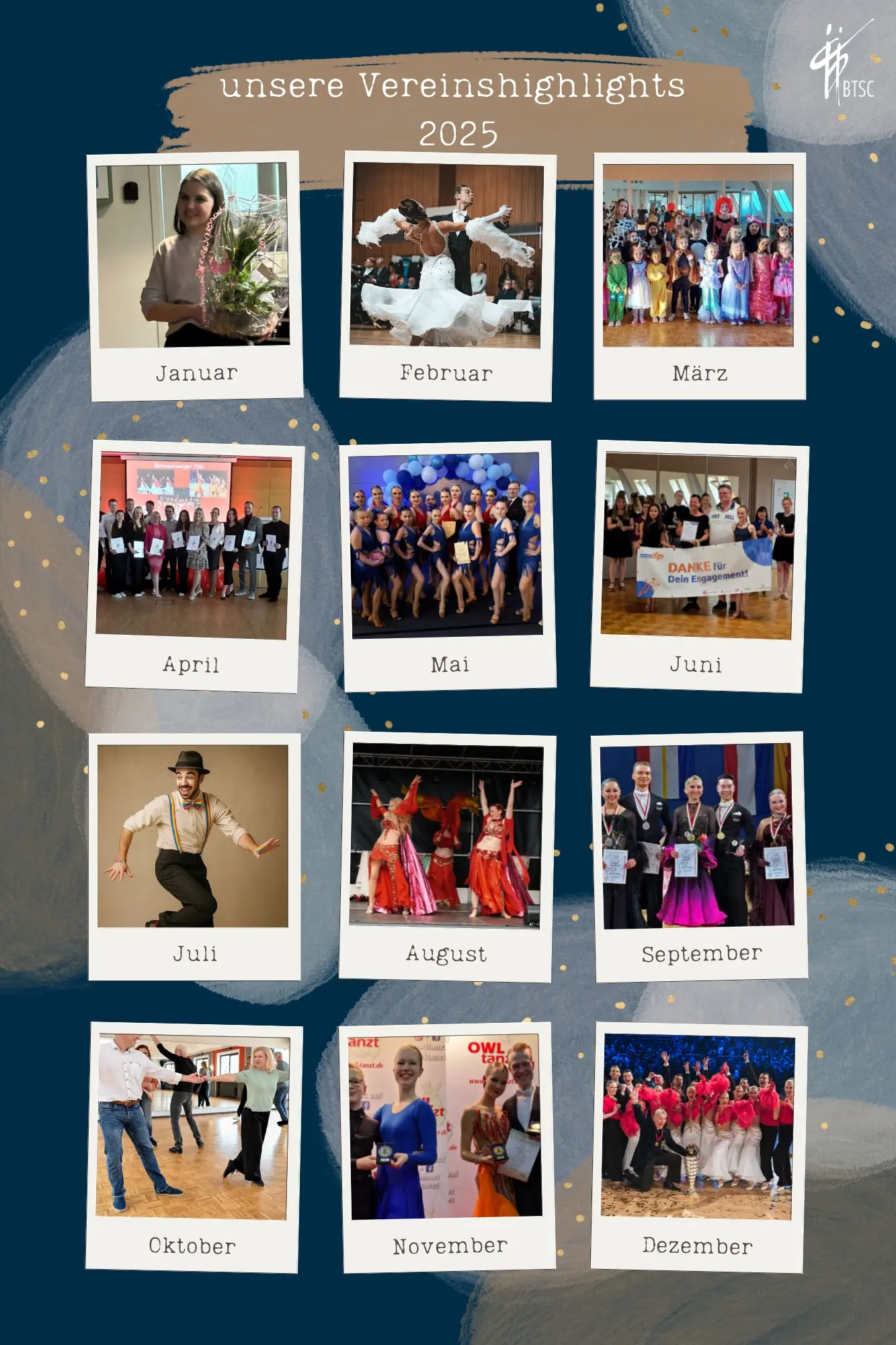Wir starteten das Jahr mit Veränderungen in der Geschäftsstelle, feierten bunte Karnevalstrainings mit unseren Kindern und erlebten starke Turnierauftritte unserer Paare und Solisten – u.a. beim Blauen Band der Spree, bei OWL tanzt und den Saxonian Dance Classics und vielen mehr … Auch bei den Landesmeisterschaften zeigten unsere Paare großartige Leistungen – wir sind sehr stolz auf euch!