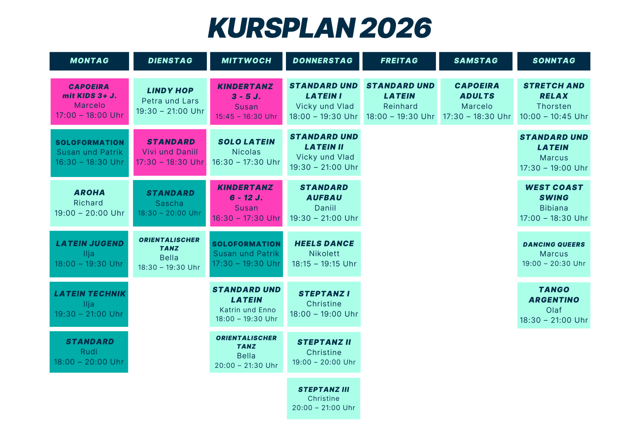 Ob im Paartanz das Parkett erobern, beim Solotanz deinen eigenen Style zeigen oder mit Fitness-Kursen richtig Energie tanken – bei uns bist du mittendrin statt nur dabei. Starte durch, push dich selbst und spüre, wie Bewegung richtig Spaß macht!