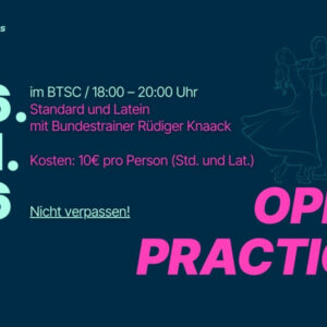 Am 26.01.2026, 18:00 bis 20:00 Uhr, bietet Bundestrainer Rüdiger Knaack im Tanzsportzentrum des Braunschweiger TSC (Böcklerstr. 219, 38102 Braunschweig) wieder eine Open Practice Standard und Latein an. Teilnehmen können Paare